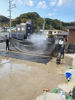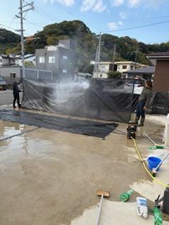 昨日は、足場に張るシートを洗いました 寒い中みんな頑張ってます